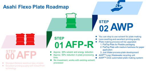 More than 70% of flexo plate producers use solvent-wash plate processing. In an ideal world, plate processing would migrate to water-wash plates, eliminating the need for solvent use and reducing the plate processing environmental footprint. At Asahi Photoproducts, we have those solutions. But we also understand that in today’s turbulent economy and competitive marketplace, it is not always easy to make the investment in new equipment to take this step. That’s why we have created a bridge product to help flexo plate producers begin their journey on the Road to Solvent ZERO.