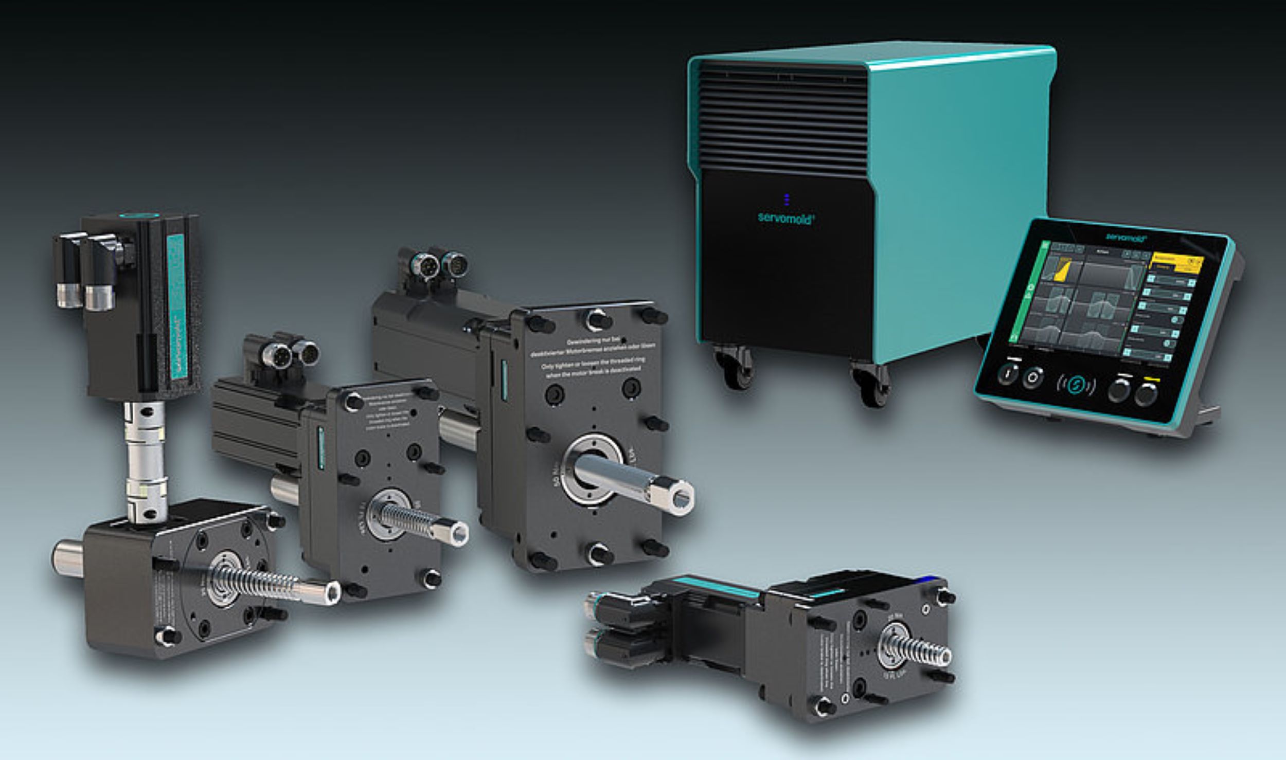 New developments from Servomold are the servo linear actuators of the SLA series and (on the left side) the servo worm actuators of the SSA series. Top right, the associated servo control system SMC-Mini with control panel. Servomold.