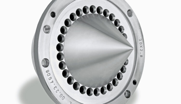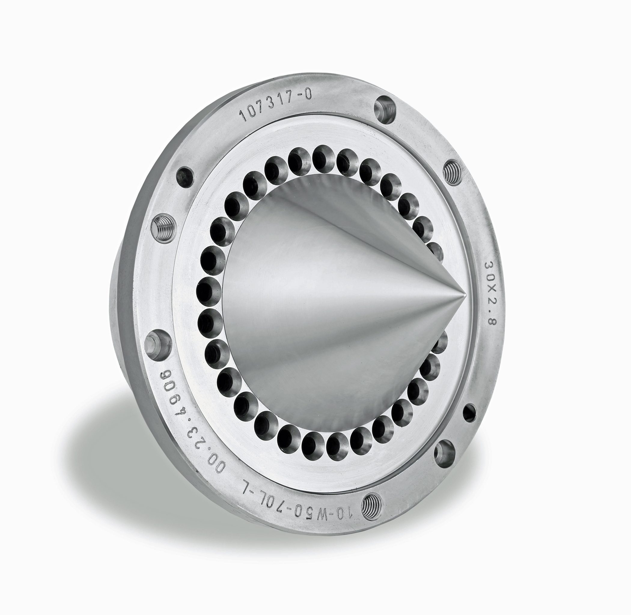 The BKG A, AH, Compact, and AHD190 families of die plates are available with the most common nozzle bore diameters. Optional features include several different carbide inlays, thermal insulation layers, pressure reduction, staggered rows of nozzle bores, and both standard and short land lengths.