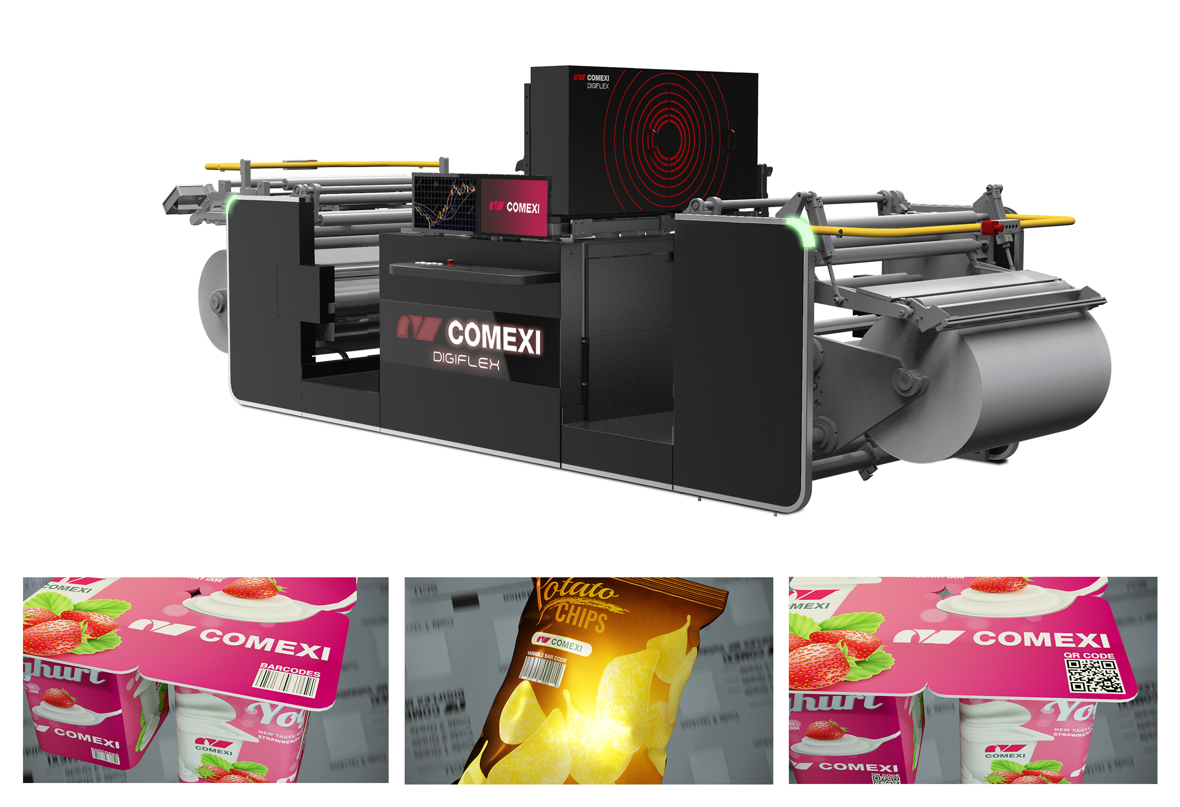 The most recent step taken by Comexi, in reference to the world of digitalization, has been digital printing, which greatly accelerates processes and time to market. Furthermore, digital printing allows for the personalization of the single prints, and the production of extremely short print runs. Within this frame of reference, Comexi Digiflex is able to print variable data such as QR codes,DOT codes, alphanumeric text, variable information, numbering, barcodes, Datamatrix or images. Each printed code is unique and contains distinct information, providing traceable material information, thus personalizing products according to the consumer’s needs, and protecting brands from counterfeiting. This innovative digital machine adds tremendous value to the final product.