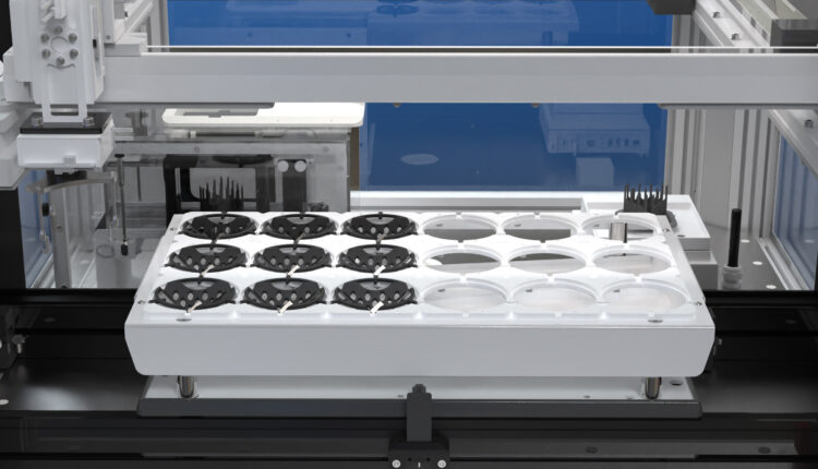 Dimensionics Density’s density determination technology elevates the classic Archimedes principle to new heights of precision, speed, and repeatability through the integration of advanced automation technology. The density determination process is meticulously designed for maximum accuracy. Samples are carefully placed within an innovatively crafted component carrier, featuring strategically positioned openings for measurement precision. These carriers glide through the system, guided by a robotic arm that ensures central and exact placement onto the vibration-insulated scales.