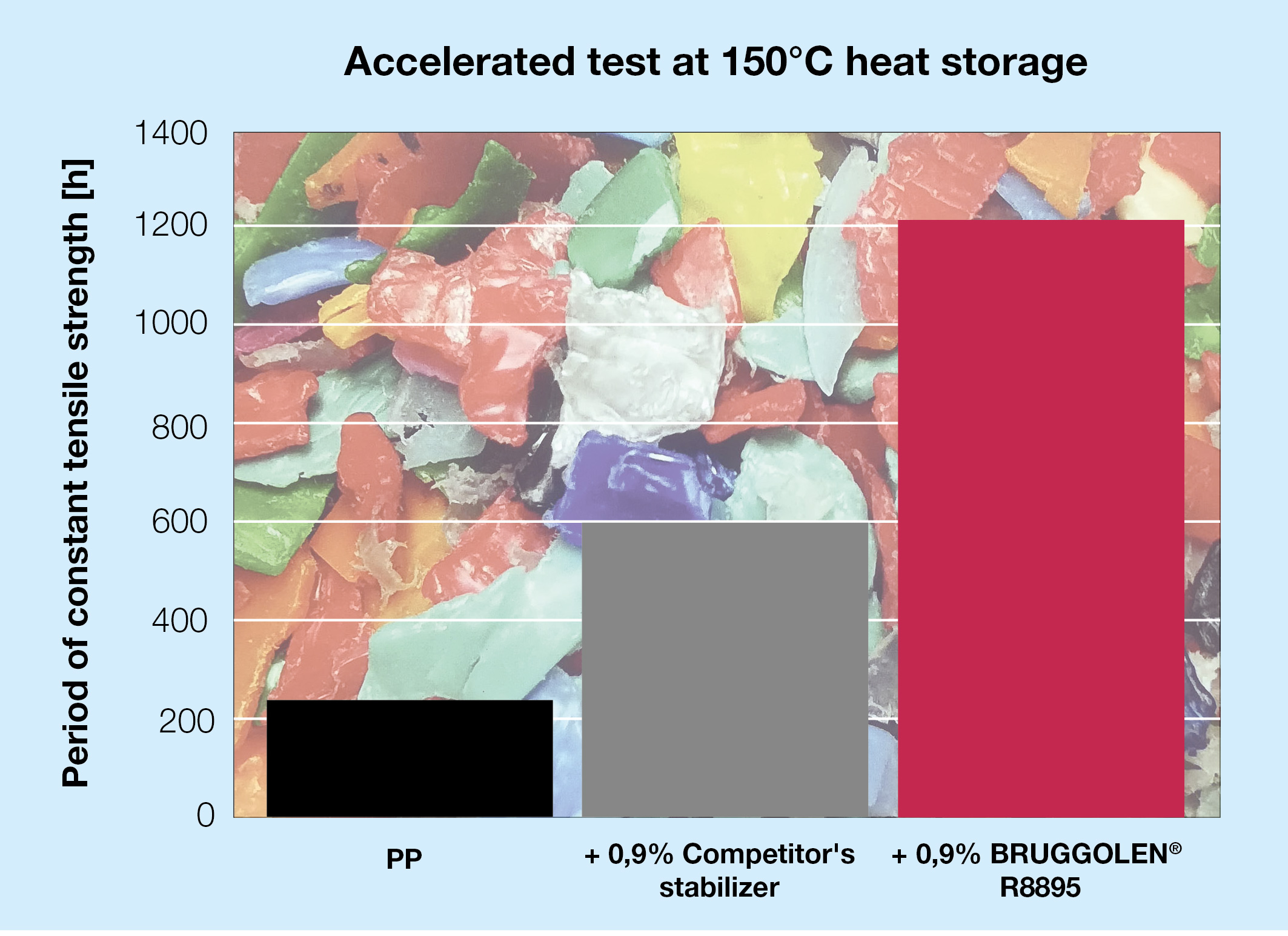 Two of the new stabilizers are intended for polypropylene recycling. Bruggolen TP-R2090 can be used to recycle post-industrial and post-consumer waste, whereas Bruggolen TP-R8895, through its increased acid scavenger content, is especially suitable for recycling polypropylene from battery cases. Both additives result in recyclates of quality that cannot be achieved via conventional re-stabilization.