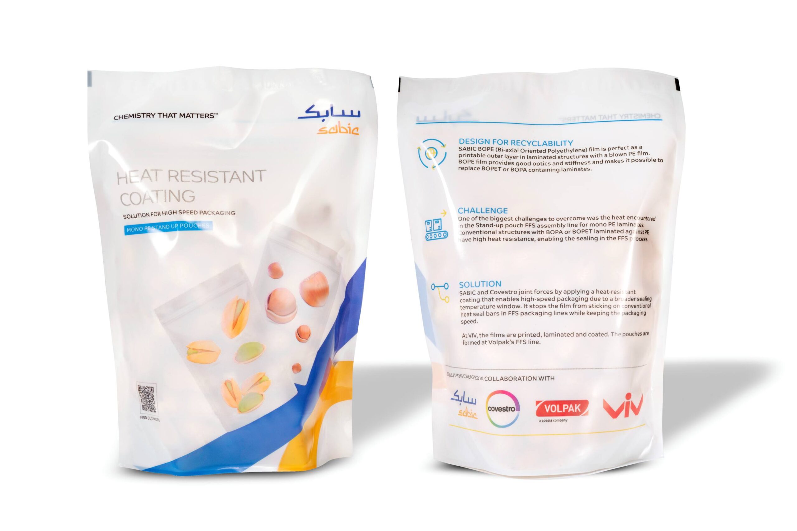 • Covestro has developed a new heat-resistant coating for use on mono-material stand-up pouches made with Sabic’s PE/BOPE technology