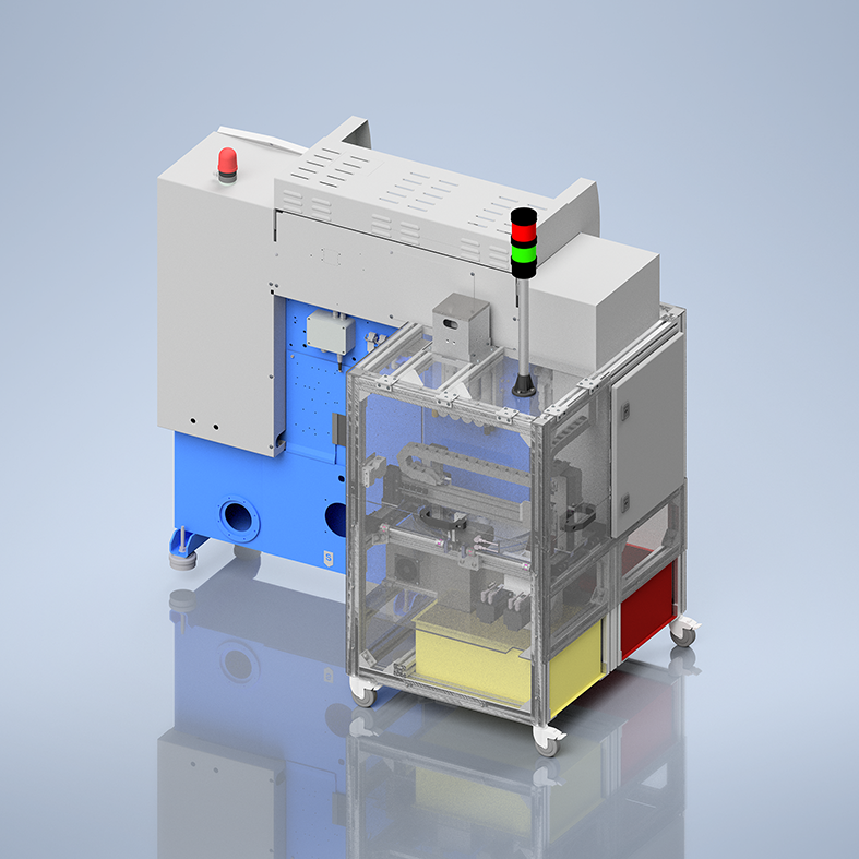An integrated camera detects the sprues on the separator and a gantry robot picks them up with a gripper. If the sprue and the article still have to be separated from each other, the article is separated by a device and falls into a box, while the sprues are ejected separately. Meanwhile, the injection moulding machines can continue production without any restrictions.