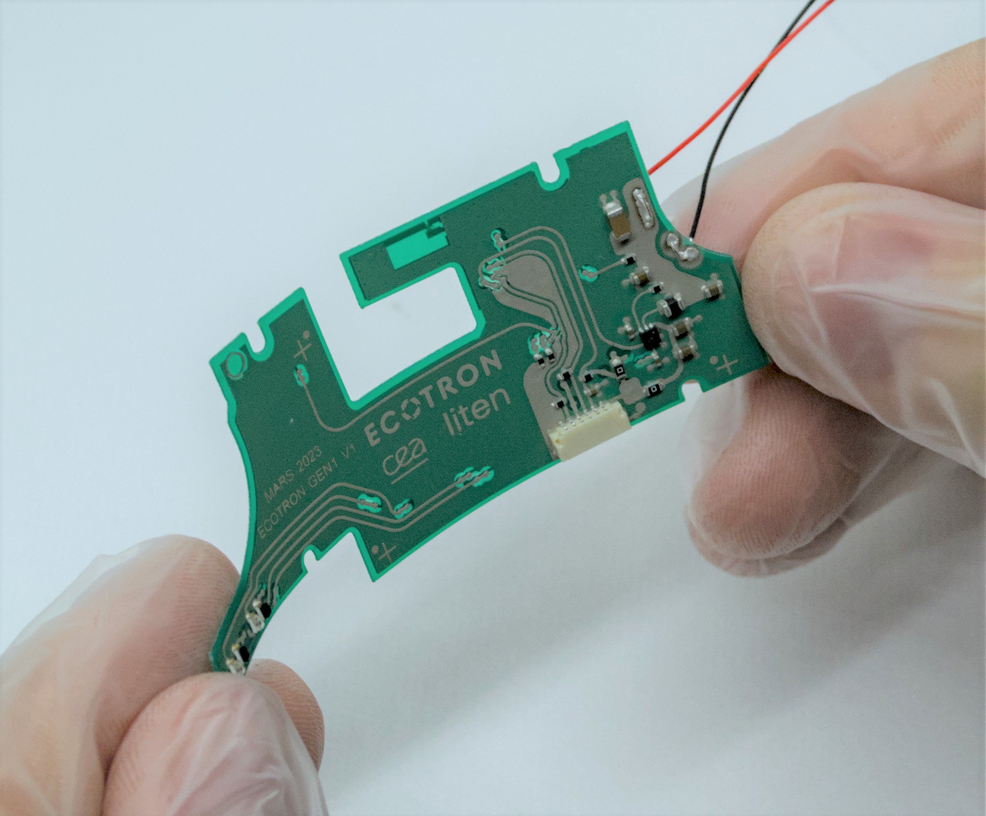 The CEA research institute in France, in collaboration with its industry partner, contributes a medical device use case with a flexible printed circuit board (PCB) within the EU-funded project ECOTRON. The first generation of the use case (GEN1) demonstrates that a conventional PCB can be replaced with a flexible printed one to create more sustainable  healthcare and wearable devices with no compromise on performance. The flexible printed circuit board is produced in an additive manufacturing process that uses less energy and chemicals. The future use case generations will include dismantling technologies (GEN2)  and bio-based/recycled materials for substrates and inks (GEN3) developed in the project.